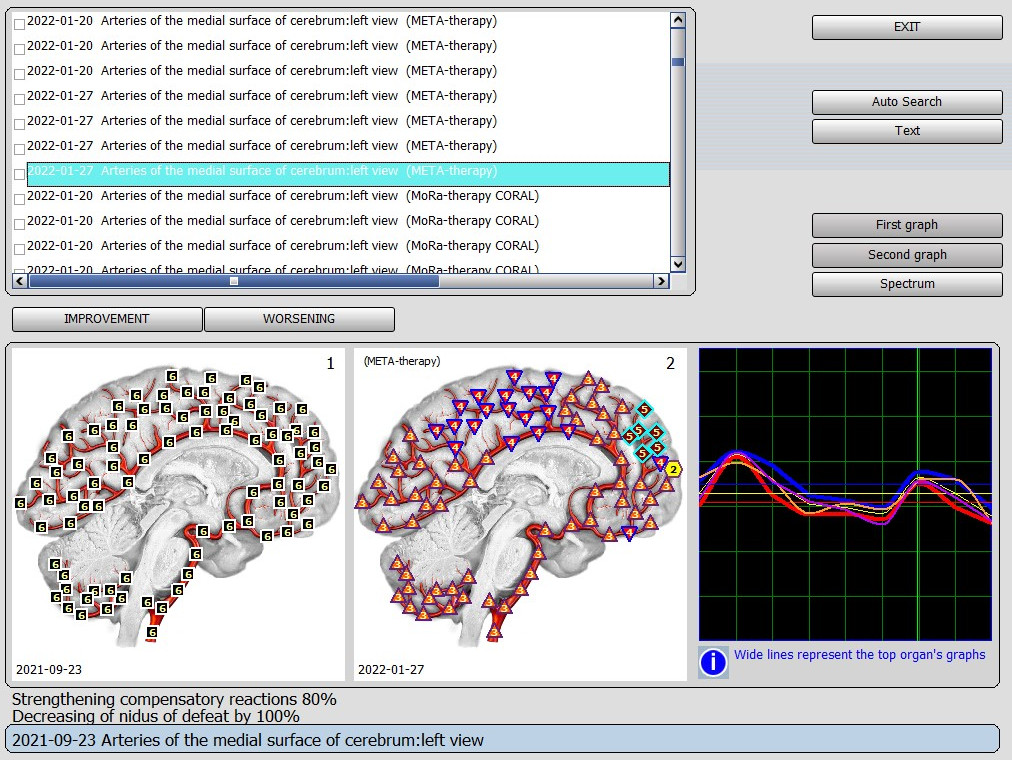 As the patient is being scanned, 3-dimensional anatomical models of the internal organs and physiological systems appear on the screen in front of them. Coloured marks placed upon the picture make it easier for the practitioner to determine the site of pathology. It is possible to identify degenerative processes in these organ systems and therefore implement therapeutic protocols in good time.