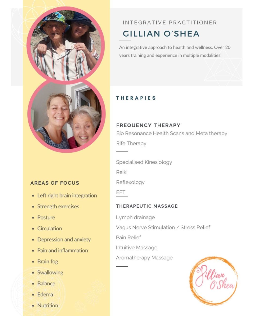 If you or a loved one is needing assistance please get in touch info@gillianohsea.com and we can discuss the best solutions. Depending on the client I am available at my practice, or in home visits or live in contracts.