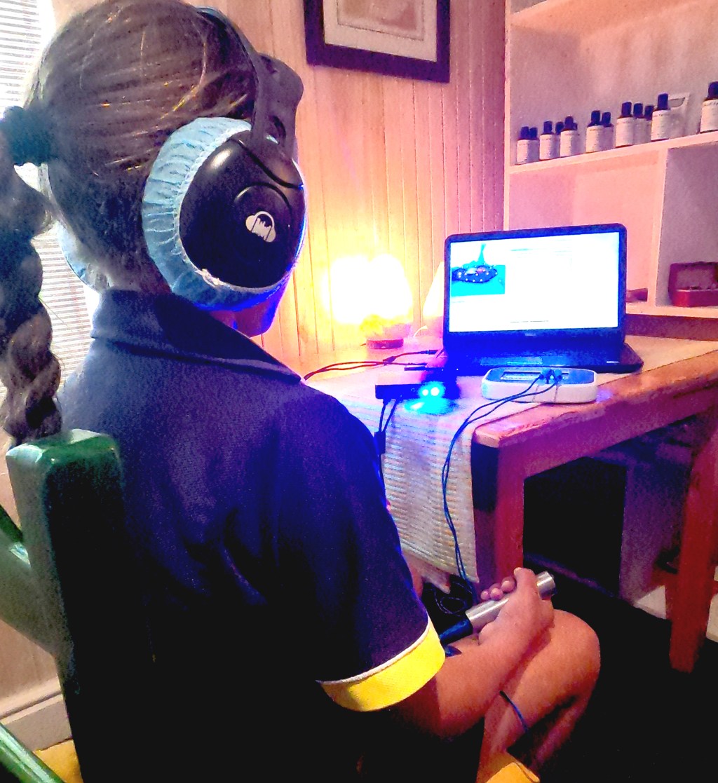To use bio resonance, earphones are placed on the client’s head and connected to a software that “reads” the energy wavelengths coming from the body. This is the process of diagnosis.