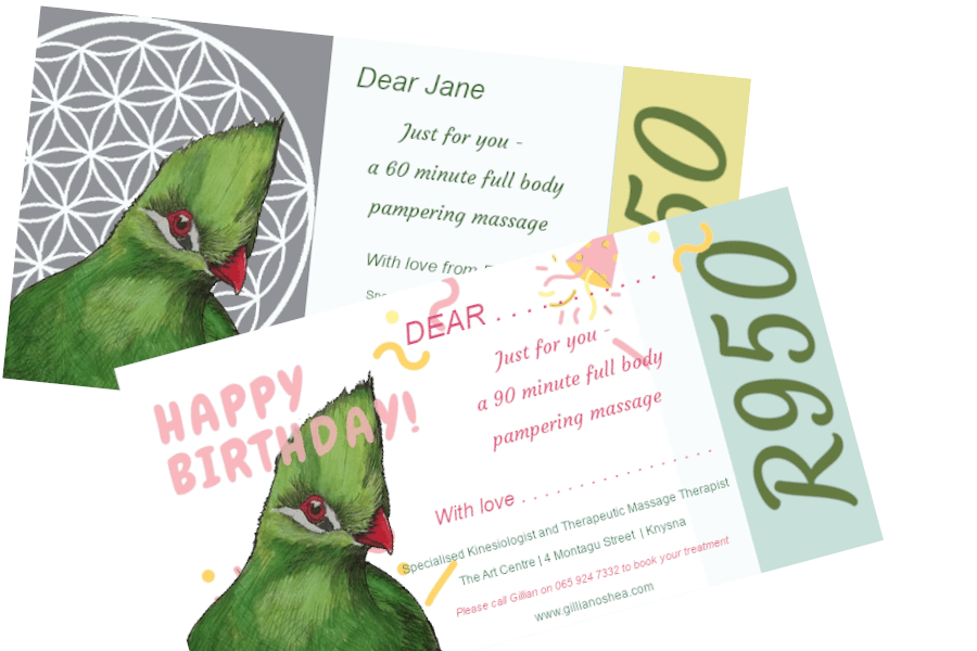 Gift vouchers are available via email. Give those you love the gift of some pampering and loving touch. Simply email or WhatsApp me with the amount you would like to spend. Include the person’s name and a personal message from you. As soon as I receive proof of payment, the voucher will be emailed to you.